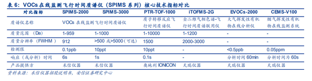 禾信儀器的 SPIMS-2000、3000 的質(zhì)量范圍與 iTOFMS-2G 相似,低于 PTR-TOF-1000;SPIMS-3000 的質(zhì)量分辨率可達(dá) 5,000,高于同行業(yè)公司的同類產(chǎn)品;SPIMS-3000 的檢測(cè)限為 10ppt,與 PTR-TOF-1000 持平,高于其他同行業(yè)公司同類產(chǎn)品技術(shù)水平。在產(chǎn)品結(jié)構(gòu)方面,SPIMS 在小型化、便攜式方面具有一定的優(yōu)勢(shì),通過(guò)車載走航可以支撐環(huán)保部門進(jìn)行VOCs 污染的快速篩查。