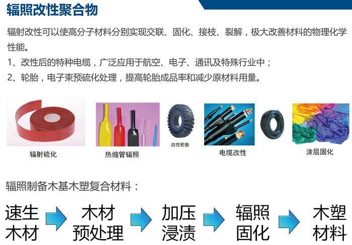 材料:涂層固化、聚合物改性、復(fù)合材料制備;輻射技術(shù)在高分子材料領(lǐng)域,主要有輻射交聯(lián)、輻射固化、輻射硫化、輻射降解、輻射接枝改性等應(yīng)用。電子束輻射的高穿透性,能使得高分子內(nèi)部均勻有效的發(fā)生反應(yīng),從而改善材料性能。