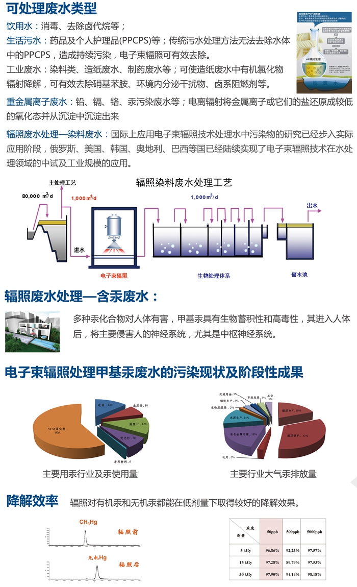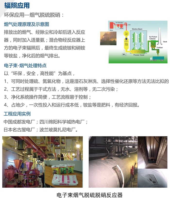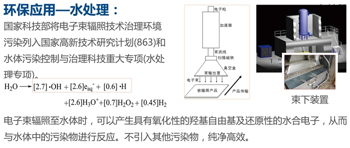 環(huán)保:環(huán)境“三廢”;輻射技術(shù)可以有效處理“三廢”(廢水、廢氣、廢渣),如煙道氣脫硫脫硝、去除揮發(fā)性有機(jī)物、各類型廢水處理、處理污泥以減少致病微生物有機(jī)體、固體廢棄物處理等,與傳統(tǒng)方法比,具有效率高、可變廢為寶、操作簡便等優(yōu)點(diǎn)。
