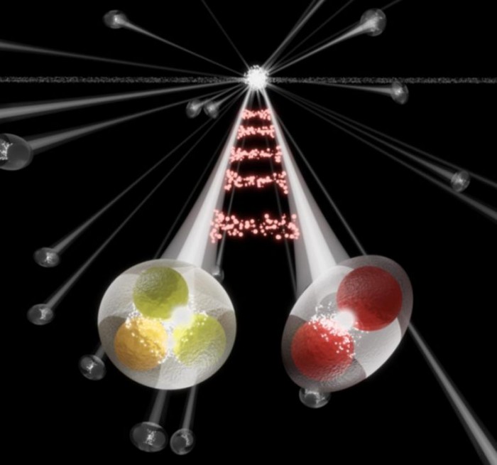 與質子和中子之間的殘余強相互作用不同,可以在原子核這樣的穩定結合狀態下進行研究,而在粒子對撞中產生的不穩定強子之間的相互作用則非常難以觀察。在大型強子對撞機中,使用一種被稱為femtoscopy的方法發現它是可能的。大型強子對撞中的強子彼此之間產生的距離非常近,大約為10^-15米。這一尺度與殘余強力的范圍相匹配,使強子在飛走之前有短暫的機會進行相互作用。因此,經歷了吸引性相互作用的一對強子會稍微靠近對方,而對于排斥性相互作用,則會發生相反的情況。通過對測量的粒子相對速度的詳細分析,可以清楚地觀察到這兩種效應。