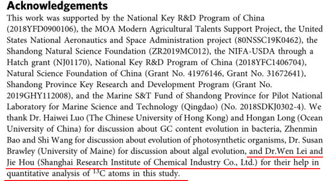 大氣二氧化碳濃度的變化在藻類植物的適應(yīng)和進(jìn)化中起著核心作用。中國(guó)海洋大學(xué)的王冬梅課題組采用新一代高通量測(cè)序技術(shù)構(gòu)建了高質(zhì)量的染色體級(jí)條斑紫菜基因組,組裝成三條染色體,通過比較基因組學(xué)分析鑒定出條斑紫菜基因組中“基因拷貝數(shù)顯著增多”的基因家族。研究成果系統(tǒng)解讀了條斑紫菜的基因組特性,揭示了驅(qū)動(dòng)紫菜異型世代適應(yīng)生境的進(jìn)化力量。本中心為其提供TCA循環(huán)中有機(jī)酸的13C豐度分析,確證絲狀孢子體吸收利用的主要碳來(lái)源途徑。該研究成果“Pyropia yezoensis genome reveals diverse mechanisms of carbon acquisition in the intertidal environment”2020年8月發(fā)布于《Nature Communications》(IF=12.5)。