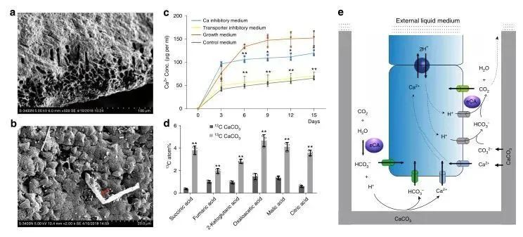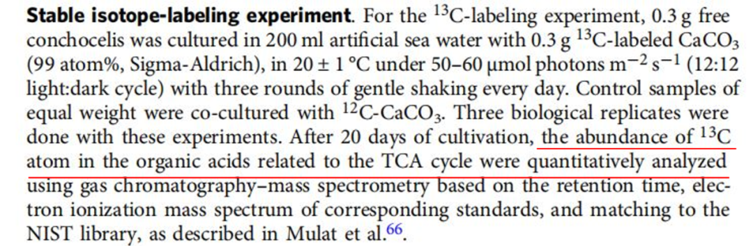 為了證實(shí)這一假設(shè),該研究用13C標(biāo)記的碳酸鈣培養(yǎng)游離絲狀體,并分析了三羧酸(TCA)循環(huán)中有機(jī)酸中13C的豐度。在標(biāo)記細(xì)胞中檢測(cè)到的13C在2.1%到4.9%之間,遠(yuǎn)遠(yuǎn)高于13C的自然豐度。證實(shí)棲居于貝殼中的絲狀孢子體在細(xì)胞外CA作用下,將貝殼中的碳酸鈣轉(zhuǎn)化為碳酸氫根,可作為絲狀孢子體吸收利用的主要碳源之一。