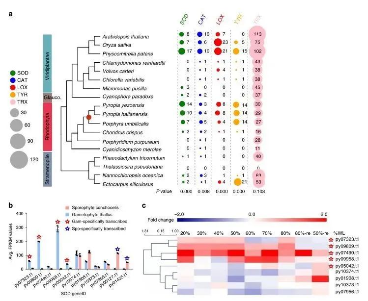 該研究采用新一代高通量測(cè)序技術(shù)構(gòu)建了高質(zhì)量的染色體級(jí)條斑紫菜基因組,組裝成三條染色體,基因組大小為108Mb,其中重復(fù)序列占比48%,蛋白質(zhì)編碼基因共12855個(gè)。通過比較基因組學(xué)分析鑒定出條斑紫菜基因組中“基因拷貝數(shù)顯著增多”的基因家族。其中與抗氧化有關(guān)的基因家族,如SOD、LOX、TRX、TYR等,均呈現(xiàn)葉狀體世代特異性的表達(dá)活性,且在失水逆境下這些葉狀體特異基因具有顯著上調(diào)的轉(zhuǎn)錄特征,表明抗氧化基因家族的擴(kuò)張及共表達(dá)特征是葉狀體世代適應(yīng)極端環(huán)境的重要遺傳基礎(chǔ)。