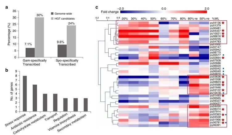 為了闡明水平基因轉(zhuǎn)移對(duì)條斑紫菜基因起源的潛在影響及其不同生活史的進(jìn)化,該研究對(duì)預(yù)測(cè)的基因庫(kù)進(jìn)行了全面的系統(tǒng)發(fā)育分析。這種方法鑒定了51個(gè)基因(約占清單的0.04%),52.9%水平基因轉(zhuǎn)移在兩個(gè)世代中的任何一個(gè)世代都有特異性轉(zhuǎn)錄(29.4%在配子體中,23.5%在孢子體中),而全基因組表達(dá)的百分比為16.7%,HGT衍生基因中階段特異性轉(zhuǎn)錄基因表達(dá)的豐富表明,這些外源序列為擬南芥屬物種提供了適應(yīng)功能,來(lái)自于細(xì)菌的基因水平轉(zhuǎn)移是條斑紫菜基因家族擴(kuò)張的進(jìn)化來(lái)源之一。