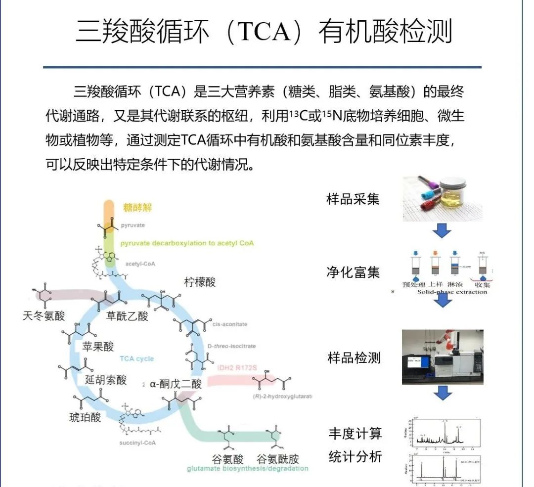上海化工研究院生物醫(yī)藥檢測(cè)中心能提供糖酵解(EMP)途徑、三羧酸循環(huán)(TCA Cycle)、氨基酸代謝、一碳循環(huán)等關(guān)鍵通路的目標(biāo)代謝物的同位素示蹤檢測(cè)及定量檢測(cè)等分析測(cè)試業(yè)務(wù)。同時(shí)提供從穩(wěn)定同位素示蹤劑定制到代謝物示蹤的穩(wěn)定同位素示蹤整體解決方案。