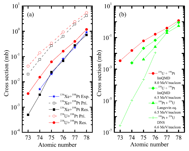 2015年,法國GANIL實驗室開展的壘上能區136Xe+198Pt核反應實驗結果顯示,相比較炮彈碎化反應,多核子轉移反應產生的中子數為126的豐中子核素生成截面要高幾個數量級,一時間,是否存在提供更大生成截面的反應體系、其反應機制如何,成為大家關注的問題之一。雖然國內外多個大型實驗室的核物理學家已經或者計劃開展類似研究,但由于其復雜的生成機制和較為困難的實驗探測技術,使得開展理論方面的預先研究十分必要。
