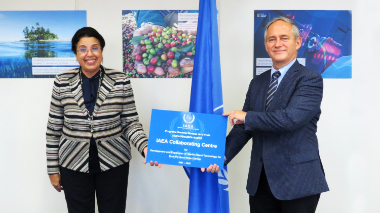 國際原子能機構(gòu)副總干事納賈特·莫赫塔爾向墨西哥駐奧地利大使兼常駐維也納聯(lián)合國代表路易斯·哈維爾·坎普薩諾·皮納移交一塊牌匾,將墨西哥國家果蠅計劃(PNMF)重新指定為國際原子能機構(gòu)合作中心。(照片:E. Orucevic/IAEA)