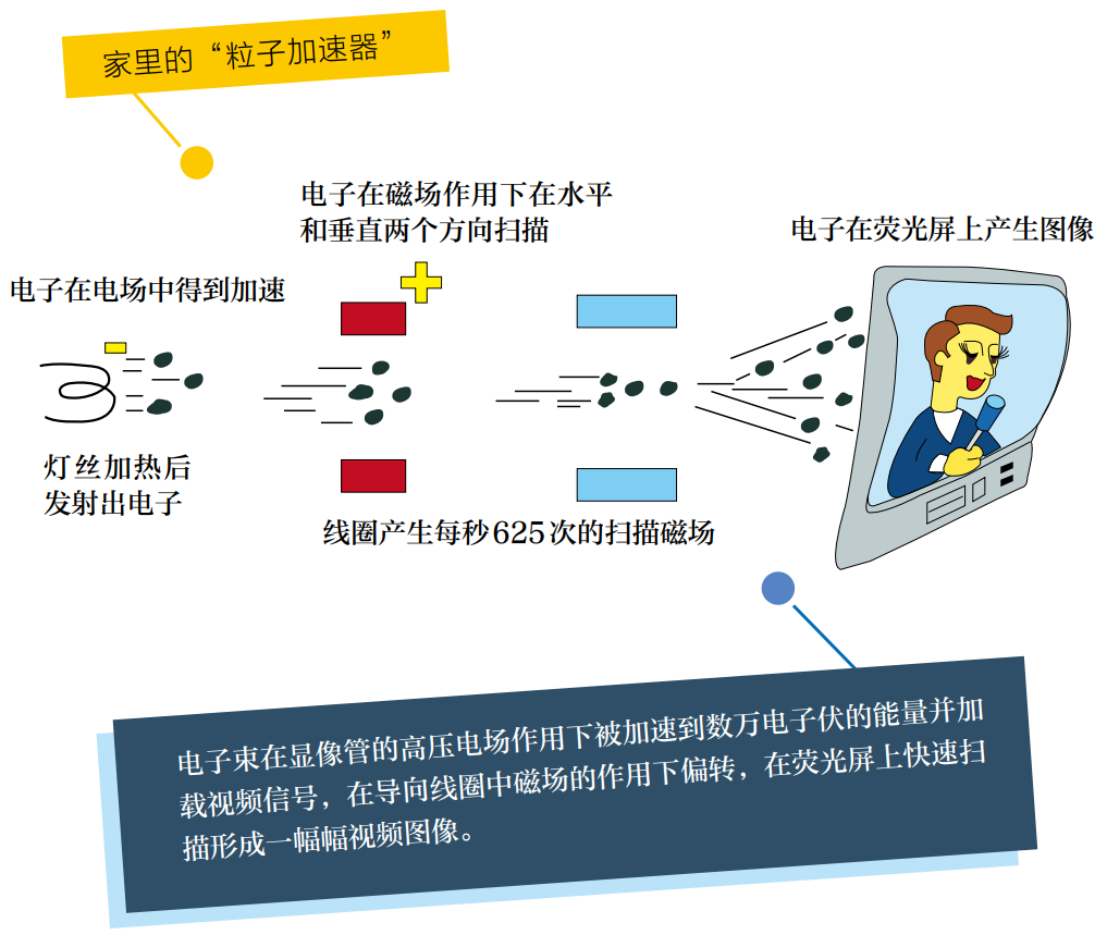 粒子加速器并不神秘,顯像管電視機就可以說是一臺迷你版的粒子加速器。打開電視機的后蓋,我們就可以看到顯像管頭部的電子槍,里面有一組金屬鎢做的燈絲作為陰極,燈絲通電加熱到高溫后,就能發(fā)射電子。在電子槍的陽極和陰極之間加上 1 萬伏左右的高電壓,把電子加速到約 1 萬電子伏的能量,投射到熒光屏上。在顯像管里,還安裝了兩組線圈,電子束在線圈產(chǎn)生的水平和垂直方向的磁場作用下,逐行快速掃描到熒光屏上,形成一幅幅圖像。在這臺“粒子加速器”里,電子槍是加速器的粒子源,線圈相當于加速器的束流導向系統(tǒng),而顯像管的熒光屏就相當于物理實驗中使用的探測器,探測電子攜帶的視頻信號。
