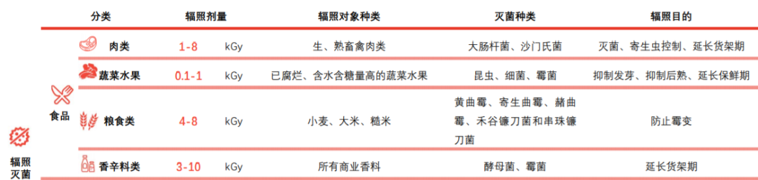 最常見的就是土豆、大蒜一類容易發芽的植物食品,可以通過射線降低或者抑制其中的分生孢子或是蒜鱗瓣芽,防止因發芽導致毒素產生或者損失養分。部分進口肉類為了延長保鮮期,也通過輻照處理,有效殺死各類寄生蟲、致病菌。輻照殺菌能在常溫下用穿透力強、能量高的射線將微生物殺死而不引起食物本身溫度升高,不影響食品的品質和味道。