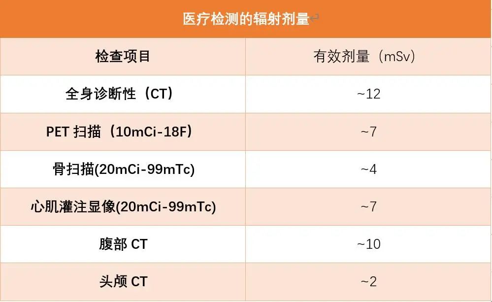 現行的PET-CT所用的18F藥物的半衰期為108.9min(放射性元素的原子核有半數發生衰變時所需要的時間),一天有24h,那么一天過后18F在人體中的含量僅為原來的((24*60)/108.9=13.22),可以說是微乎其微。口說無憑,下表為一些醫療檢測的輻射劑量。