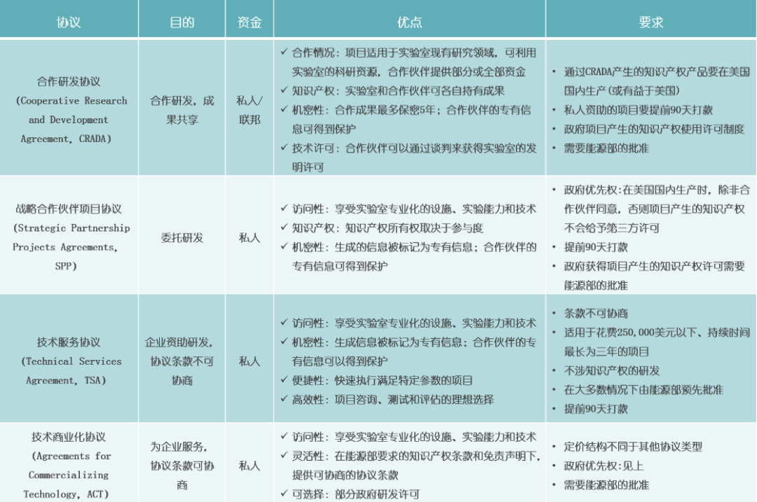 與上一部分“高冷”實驗室明顯不同的是,這些更為“熱情”的實驗室在與企業的合作方式上更為多樣。以布魯克海文國家實驗室為例,該實驗室為企業提供了四種不同類型的合作協議,創造了靈活的選擇空間。具體情況可見圖2-5。
