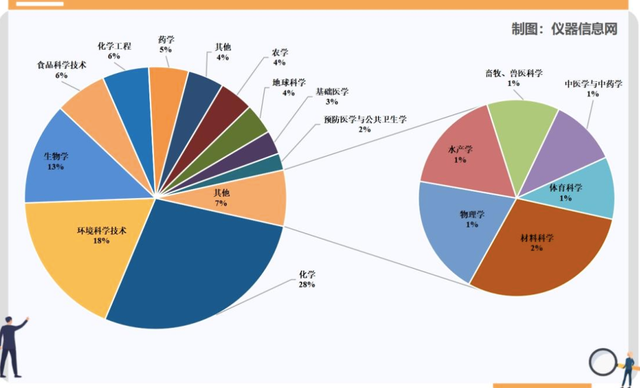 從儀器所屬學科分布可以看出,質譜儀主要用于化學、環境科學技術、生物學、食品科學技術、藥學等研究,占比分別為28%、18%、13%、6%以及5%。