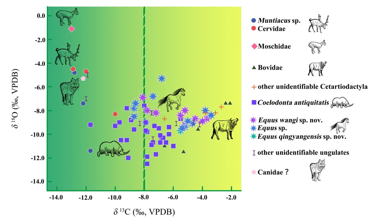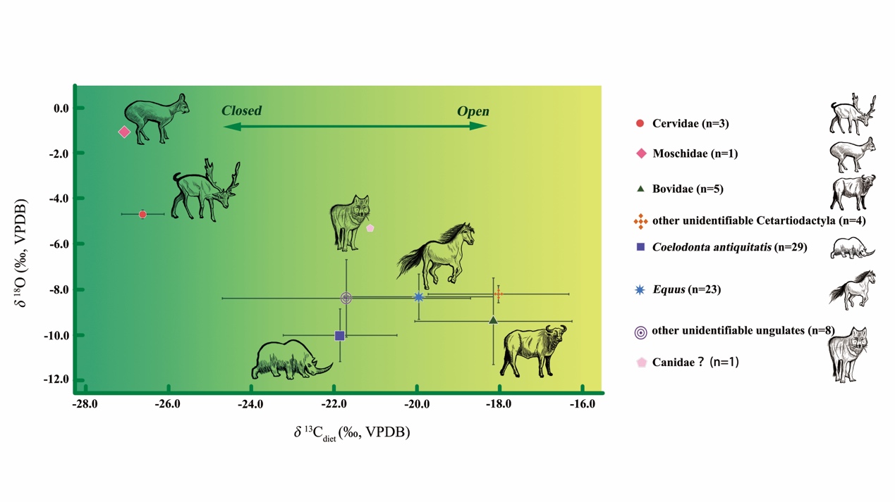 麻地溝遺址動物群δ13C和δ18O值分布散點圖(徐哲供圖)