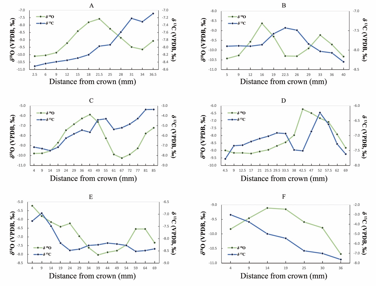 麻地溝遺址位于泥河灣盆地東部岑家灣臺地西北緣。2007年,裴樹文在該遺址進行大規模的調查和發掘工作,古地磁研究表明古人類在麻地溝遺址活動的時間大約為距今1.2Ma,處于中更新世氣候轉型期(Middle Pleistocene Climate Transition-MPT)。科研人員選取了77枚出土自麻地溝遺址的哺乳動物牙齒標本,通過牙釉質的整體采樣和序列采樣進行碳氧穩定同位素分析,重建麻地溝遺址的生態景觀與區域環境的季節變化。整體取樣結果表明,MPT初期,麻地溝遺址區域環境表現出多元的特征,植被景觀包括純C3環境、C3/C4混合環境以及接近純C4的環境,其中以C3/C4混合環境占據優勢。這反映了該區域的生態特征包括較為密閉的林地環境和較為開闊的疏林草原環境,并以后者為主導。序列取樣結果則進一步顯示,C4植被在某些時段內占據一定的優勢,表明麻地溝遺址C4植被在整個區域景觀中具有重要地位;周邊區域環境經歷著干濕冷暖的季節性變化,整體環境多變。