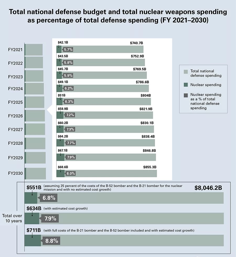 國會預算辦公室(CBO)估計,在未來10年內,美國將花費6340億美元來維持和現代化其核武器庫,這比2019年前公布的10年計劃高出28%。預計在2021—2030財年的計劃支出預計將消耗這些年國防支出總額的6—8.5%。在未來30年內,美國核力量的維持和現代化總成本可能達到2萬億美元。