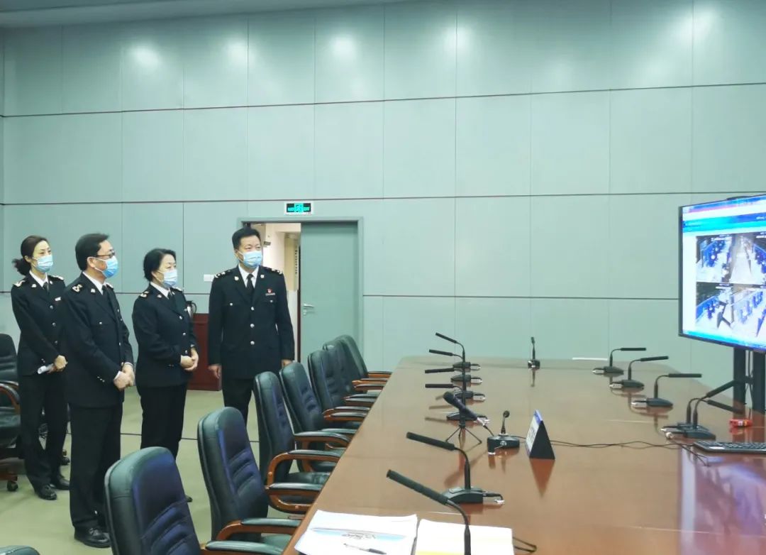 高玉潮(左二)在北京海關(guān)監(jiān)控指揮中心督導(dǎo)冬奧通關(guān)服務(wù)保障工作