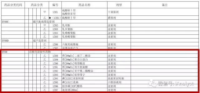 2017年2月23日,人力資源與社會保障部發布《國家基本醫療保險、工傷保險和生育保險藥品目錄(2017年版)》。其中,診斷性核藥首次上榜,如下表所示。入選醫保目錄,將為核技術在醫藥領域的應用,打開廣闊的成長空間,也為需要核藥治療的患者帶來福音——可以報銷了。