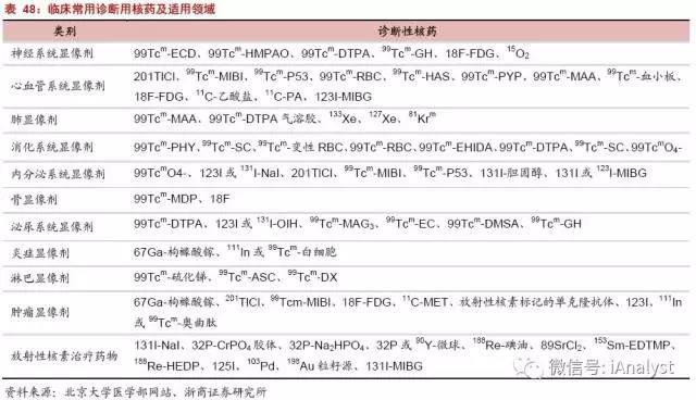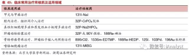 治療用核藥進行疾病治療的原理是,通過其產生的局部電離輻射對病變組織進行輻照,從而抑制或破壞病變組織達到治療的作用。治療用核藥種類較多,其中碘-131用于治療甲亢的應用時間較久,碘-131在進入甲狀腺后通過釋放β與γ射線對甲狀腺進行輻照從而達到減少甲狀腺激素分泌,緩解甲亢的效果。根據東誠藥業重組云克藥業草案介紹,國內治療用核藥已經在鍶-89、釤-153、錸-188緩解骨轉移癌的疼痛,釔-90微球用于肝動脈介入治療原發性或轉移性肝癌,碘-125、鈀-103等放射性密封籽源治療難治性實體腫瘤,碘-131、釔-90Y等放射性核素標記的單克隆抗體等生物分子藥物用于霍金斯淋巴瘤和實體瘤的治療,等諸多領域都取得了長足進展。表49為目前主要治療性核藥及其相應應用領域。