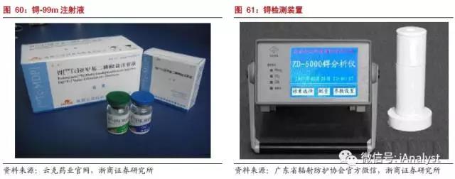診斷性核藥當中的锝-99m半衰期極短,僅有6.02小時,衰變方式為γ衰變,無β射線釋放,同時其所釋放γ射線能量僅為0.141MeV,這使得使用锝-99m進行顯像對人體造成的傷害較小,而且能夠在較短時間內消除,因此成為了診斷性核藥中的主力軍。根據2015年8月東誠藥業增發收購云克藥業股權草案中介紹,診斷用核素藥物中锝-99m及其標記化合物占80%以上,廣泛用于心、腦、腎、骨、肺、甲狀腺等多種疾患的檢查;此外碘-131、鎵-67、鉈-201、銦-111等放射性核素及其標記物也有較多的應用;隨著PET/CT顯像儀器的推廣應用,碳-11、氮-13、氧-15,尤其以氟-18等短半衰期正電子放射性核素的應用也逐年增多。圖60與61分別為锝-99m與相應的檢測設備。