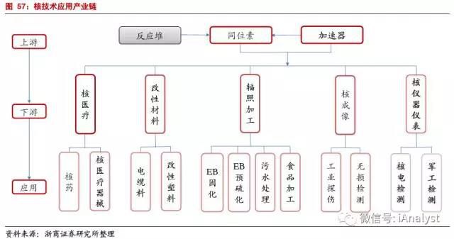 核技術應用產業鏈簡單可以分為上游的射線發生裝置,以及下游具體應用領域兩個環節,如圖57所示,上游射線發生裝置為整個核技術應用發展的基石。射線發生裝置主要類型有:反應堆、加速器和同位素三類;下游的具體應用領域包括:改性材料、核成像、輻照加工、核醫療、核儀器儀表等幾大類。