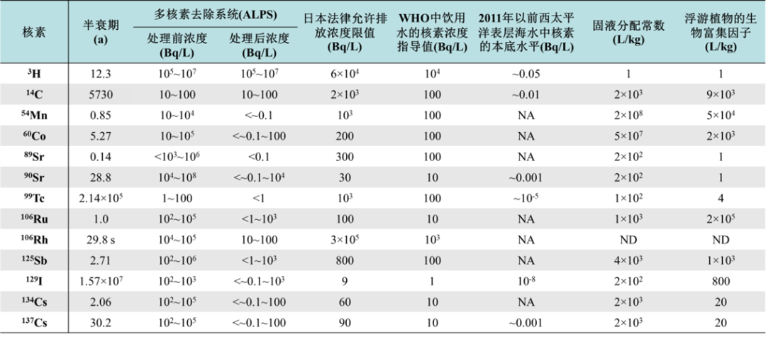 表 多核素去除系統(ALPS)處理前后,福島核廢水中部分放射性核素的污染現狀及特征