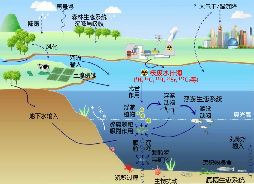 福島核廢水中放射性核素的海洋生物地球化學過程示意圖