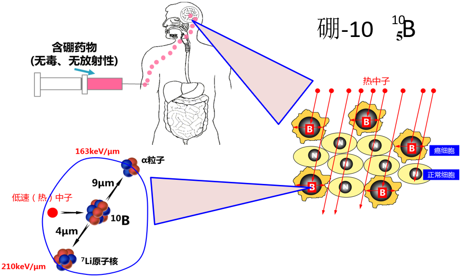 注射易被癌細胞吸收的硼10化合物,當硼化合物到在癌細胞中聚集時,利用低能熱中子束進行照射。硼10元素在吸收中子后會發生核反應,分裂成具有強大細胞殺傷力的重荷電粒子,即α粒子和鋰7粒子,飛行距離只有一個細胞大小,只會破壞單個細胞,而未吸收硼10的正常細胞就不會受到熱中子的影響。因此,硼中子俘獲治療是極有希望的惡性腫瘤精準治療方法。