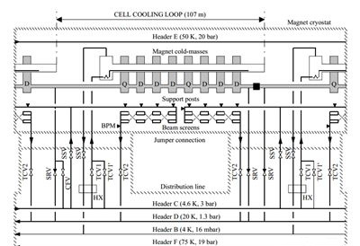 LHC的低溫系統是世界上最大的低溫系統,也是地球上最冷的地方之一。LHC建造在一個約26.7km的隧道中,隧道中是環形超導加速器,可以提高粒子的能量。LHC的低溫系統覆蓋了整個環形超導加速器,可以為超導加速器的高場磁體提供超流氦溫區的冷卻(1.9K以下)(外太空溫度約2.7K)。