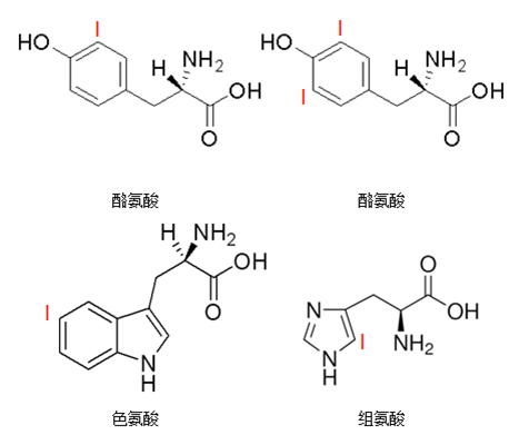 一般情況下,碘化反應只能發(fā)生在蛋白質或多肽的雜環(huán)氨基酸上(如下圖所示),且以空間結構中暴露的酪氨酸殘基為主,酪氨酸最容易標記,其次是色氨酸和組氨酸。