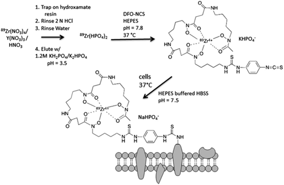 通過2步合成,先將89Zr與p-NCS-Bz-DFO,89Zr記的p-NCS-Bz-DFO再與細胞膜表面蛋白氨基相結合,從而實現(xiàn)細胞的標記。如下圖所示。