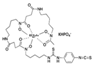 DFO-Bz-NCS的Bz-NCS基團可以和抗體的游離氨基發(fā)生偶聯(lián)反應形成穩(wěn)定的硫脲鍵,DFO的三個異羥肟酸基團可以與89Zr4+ 離子發(fā)生螯合反應,最終使抗體標記上89Zr,標記流程如下圖所示。