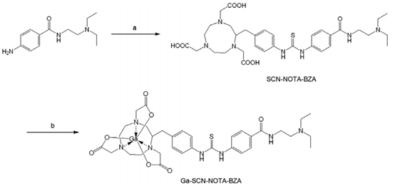 以雙功能螯合劑作為橋梁,68Ga可以和生物活性物質形成穩(wěn)定的標記物。常用于68Ga標記的雙功能螯合劑為DOTA和NOTA。
