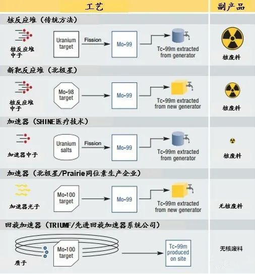 除此之外,BWX 技術公司最近宣布利用中子俘獲生產99Mo,他們俘獲中子的方法正在申請專利。該公司的前身Babcook-Wilcox公司,有多年建造商用和艦艇核反應堆的經驗,不過,他們沒有更多地透露99Mo的生產工藝。他們已經收購了加拿大公司Nordion,后者擁有從99Mo中提取99m Tc的工藝技術,因此,他們是不容小覷的競爭者。