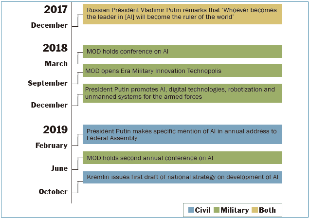 俄羅斯自2017年以來關于人工智能的公開聲明清楚地表明,俄羅斯政府高層將人工智能視為一種顛覆性的技術,俄羅斯必須利用其潛力,包括在軍事領域,以維護其強大的實力。2018年,普京宣布“數字技術和人工智能、機器人化,無人系統所有這些都應列入軍隊的發展議程。”在2018年3月俄羅斯國防部組織的一次會議上提出的人工智能十點計劃主要是為了確定研發重點和俄羅斯探索的方式,這十點計劃沒有說明俄羅斯是否會將人工智能用于軍事任務,其重點是發展人工智能基礎層面的能力。因此,目前依然不能確定俄羅斯國防部是否正在制定一項全面的人工智能軍事戰略。