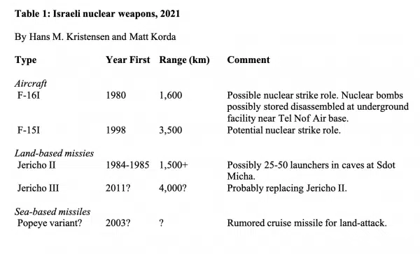 報告稱,以色列政府的核模糊政策使研究非常具有挑戰性,由于以色列政府或其他國家情報機構沒有發布官方公開信息,人們對以色列的核武庫的猜測大多不準確。報告認為,以色列最可能的核彈頭庫存數量約為90枚,供飛機、陸基彈道導彈和可能的海基巡航導彈運載。