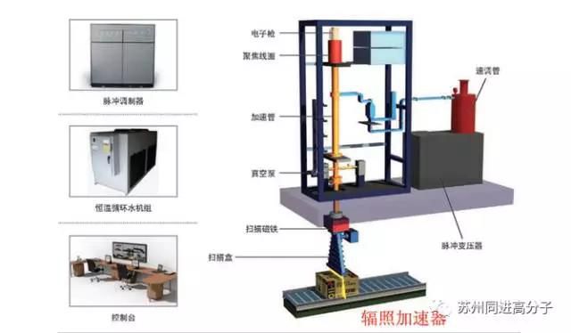 另外,用于輻照加工的高能射線主要有兩種:一種是放射性同位素(如鈷-60)釋放的γ射線,另一種是電子加速器產(chǎn)生的高能電子束。由于放射性同位素鈷-60存在殘留核廢料處理等諸多弊端,逐漸由電子加速器技術(shù)所替代已成為世界公認(rèn)的發(fā)展方向和主流。所以就以電子加速器來(lái)講,上圖就是電子加速器設(shè)備結(jié)構(gòu)模型。