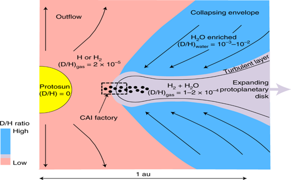 通過這塊隕石,科學家們有史以來第一次能夠直接測量其記錄。第二個氣體庫富含水蒸氣,并且已經有了地球上水的同位素特征。它是由太陽系內部高溫區域的大量星際水涌入而產生的,在星際包絡層坍塌和原行星盤形成時產生。