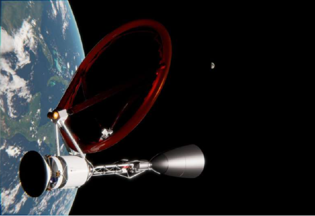 麥吉爾大學的設計方案被稱為“激光-熱能推進系統”,依靠地面一組紅外激光器,寬度10米,結合許多不可見的紅外光束,每一束波長大約1微米,總功率為100兆瓦——這相當于8萬個家庭的供電需求。該飛船將環繞在橢圓形中等地球軌道上,飛船有一個反射器,可將來自地球的激光束導向至一個包含氫等離子體的加熱艙中,當加熱艙核心被加熱到7.2萬華氏度時,其核心周圍的氫氣將達到1.8萬華氏度,并從一個噴嘴噴出產生推力,在58分鐘內推動飛船離開地球,在地球自轉時,側推進器將使飛船與激光束保持方向一致。