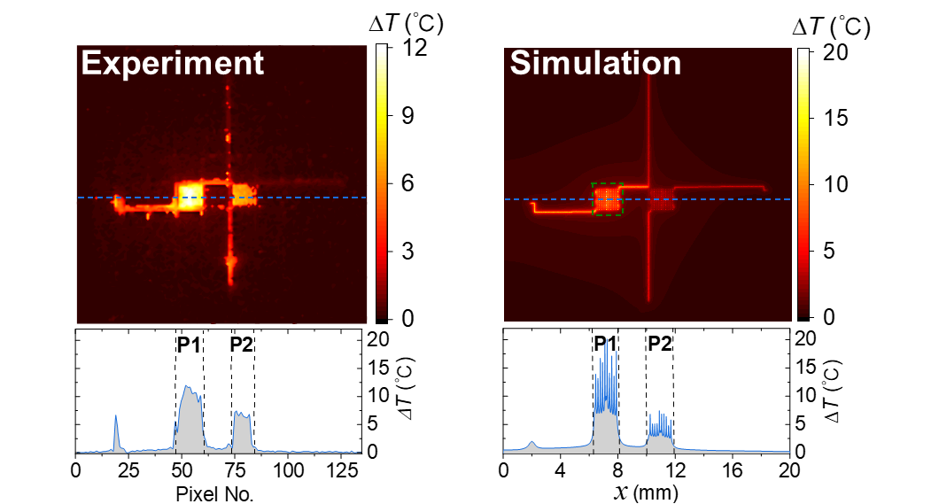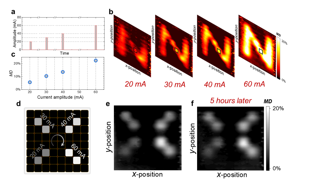 焦耳熱改變VO2電導率的同時會引起周圍像元的溫度上升,從而引起熱串擾。為解決這一問題,利用高熱導率的液態金屬填充在樣品與金屬加熱板的間隙,以優化熱接觸。在像元的熱串擾測試中,采用不同幅度的偏置電壓控制相鄰的兩個像元。熱成像儀測試和仿真結果表明,熱串擾被大大抑制(圖2)。在施加直流偏置將VO2驅動至最大回滯點后,該器件可以在不同峰值電流脈沖的驅動下實現太赫茲反射幅度的多態寫入和讀取,通過撤除直流偏置可以實現狀態的擦除。在此基礎上,我們以串行寫入的方式在該空間光調制器上寫入和保存了不同強度的圖像“N”(圖3)。最后,通過不同強度電流脈沖同時寫入空間光調制器,實現了多灰階圖像的寫入。撤掉電激勵后,該圖像保存時間超過5個小時。