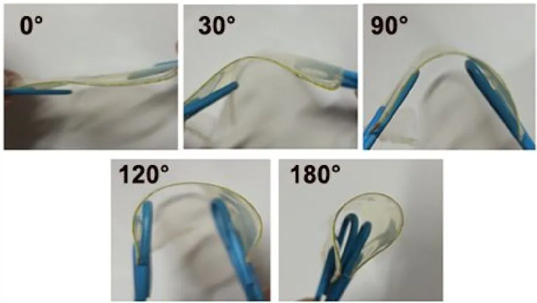 近期南京航空航天大學的科研人員采用一種簡單的旋涂方法成功地制備了聚合物包覆的Au/Cs4PbI6/Au薄膜,這種柔性探測器可實現對折彎曲、且無明顯衰減的高靈敏X射線探測。