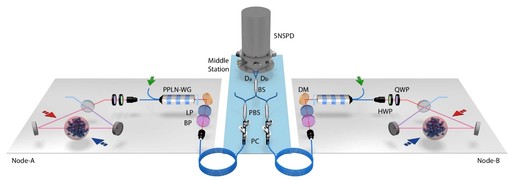 中國科學技術大學潘建偉、包小輝、張強等與濟南量子技術研究院和中國科學院上海微系統與信息技術研究所合作,在量子中繼與量子網絡方向取得突破。他們通過發展高亮度光與原子糾纏源、低噪高效單光子頻率轉換技術和遠程單光子精密干涉技術,成功地將相距50公里光纖的兩個量子存儲器糾纏起來,為構建基于量子中繼的量子網絡奠定了基礎。