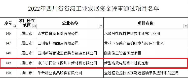 2月18日,四川省經濟和信息化廳發布了《關于2022年四川省省級工業發展專項資金現場核實通過項目的公示》,中廣核拓普(四川)新材料有限公司(以下簡稱“四川拓普”)申報的四川省工業發展資金項目—新型高效電纜料個性化定制項目位列其中。