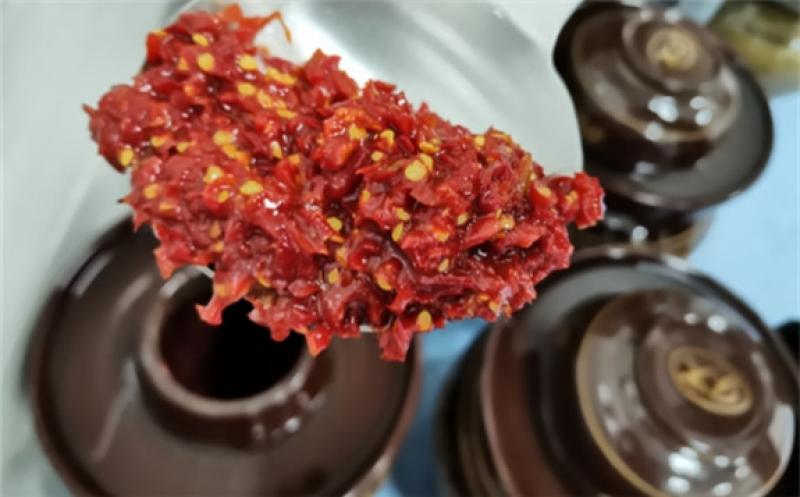 房內一角,擺放了20多個大大小小的陶制醬壇。“這些都是我們做實驗的豆瓣醬,含鹽量從10%—20%不等,按照現有相關標準減鹽豆瓣醬應該低于15%。”李治華揭開一口壇蓋,用勺子輕輕舀出半勺醬,顏色紅亮,辣香濃郁。