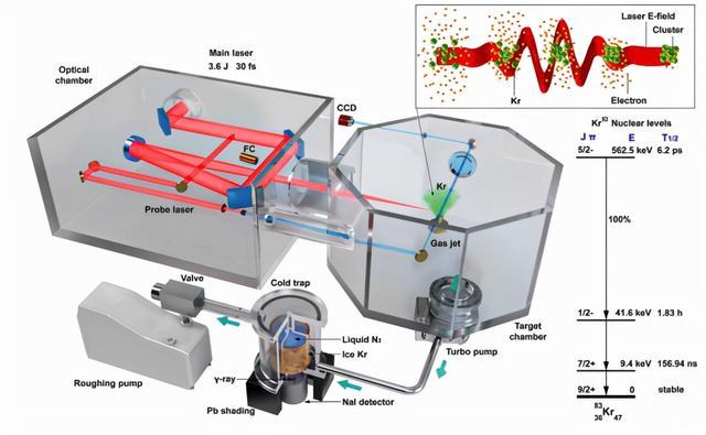 再聯想到電子的非線性共振能把電子能量加熱到兆電子伏,足夠將 83Kr 原子核庫倫激發到第三激發態,這樣的激發效率與理論值吻合較好。同時,由于非線性共振加熱的時間在 20fs 尺度,故他們判定這是一種超快的核激發。