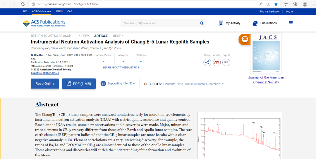 3月17日,原子能院核物理研究所在國際化學領域最具權威和最有影響力的期刊之一《美國化學會志》上發表關于嫦娥五號月壤中子活化分析研究的文章。文章指出,嫦娥五號月球樣品中的主量元素、微量元素和痕量元素與地球樣品以及美國阿波羅月球樣品中的元素存在很大差異。嫦娥五號樣品中多種元素存在明顯關聯規律。 此次嫦娥五號月壤樣品的研究成果對于加深人類對月球演化的認識,以及我國后續對月球探測與資源開發和利用具有重要意義。
