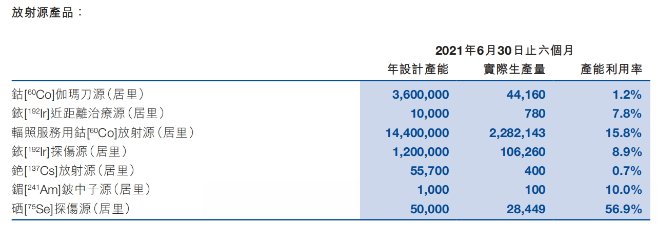 中國同輻放射性產品產能情況 來源:2021年中報
