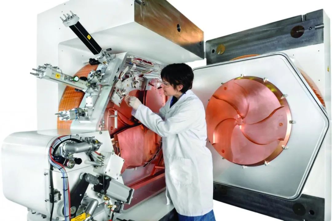 回旋加速器可以將質子加速,加速后的質子如子彈一樣轟擊原子核,使得原子核分裂或衰變,從而生產出我們需要的同位素。例如,碳11的生產,就是用質子轟擊氮14的方法制作的。