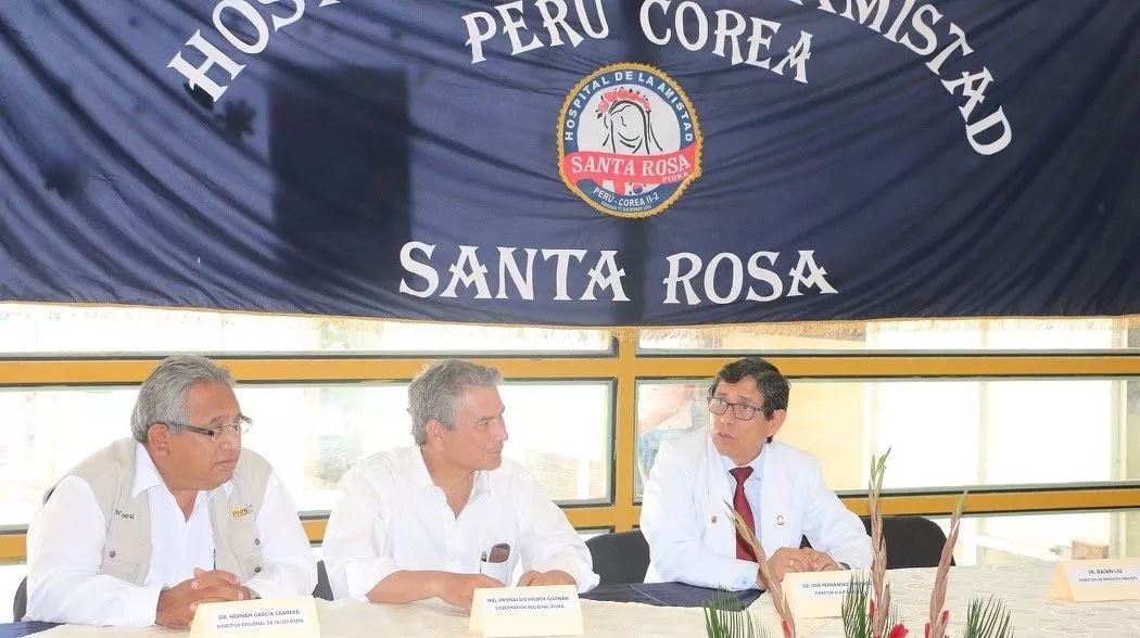 (從左至右)皮烏拉衛(wèi)生廳廳長、省長,圣羅莎秘韓友誼醫(yī)院院長在開機儀式上講話