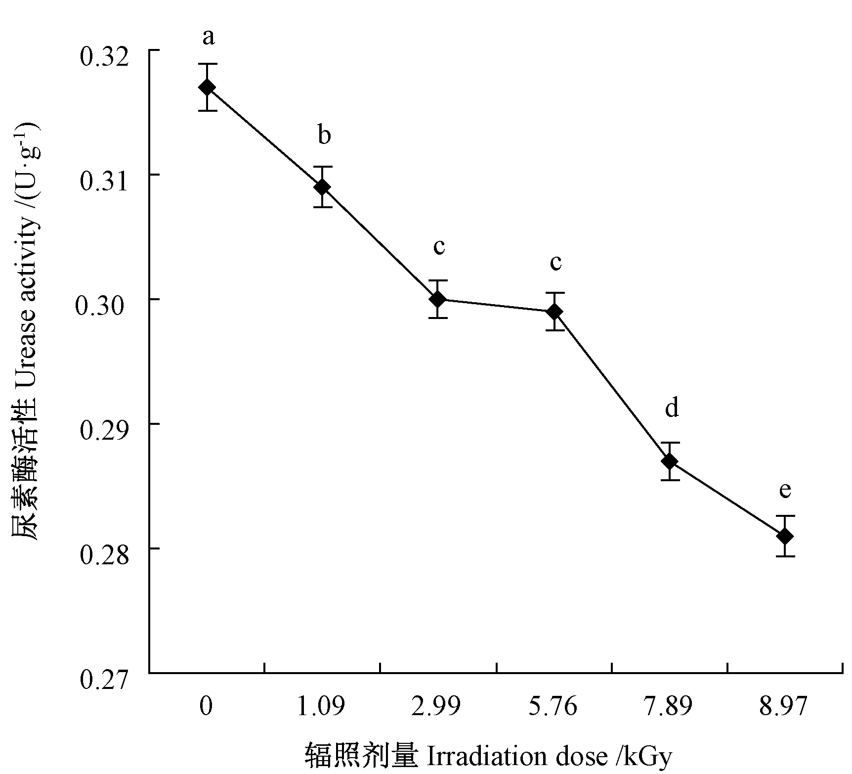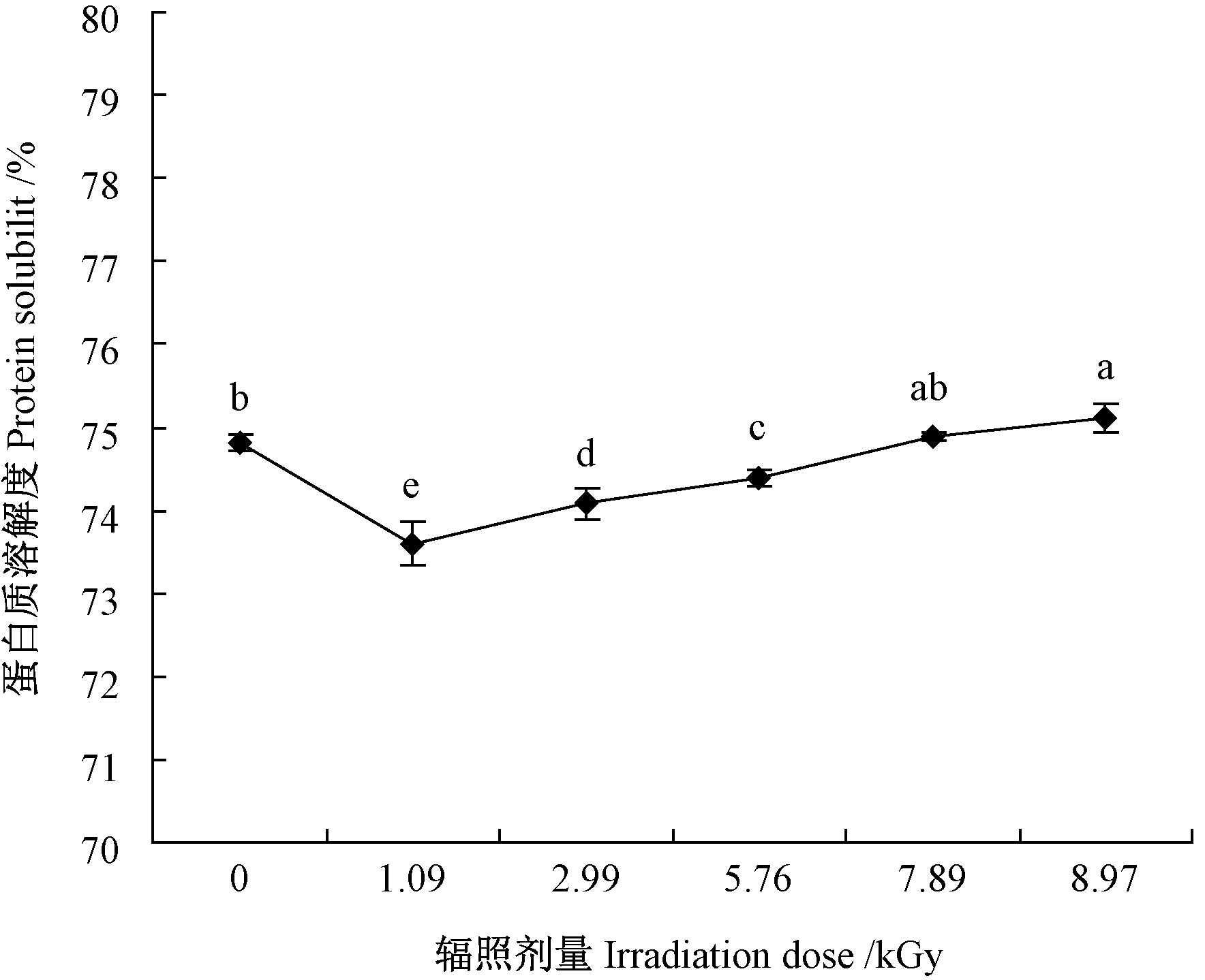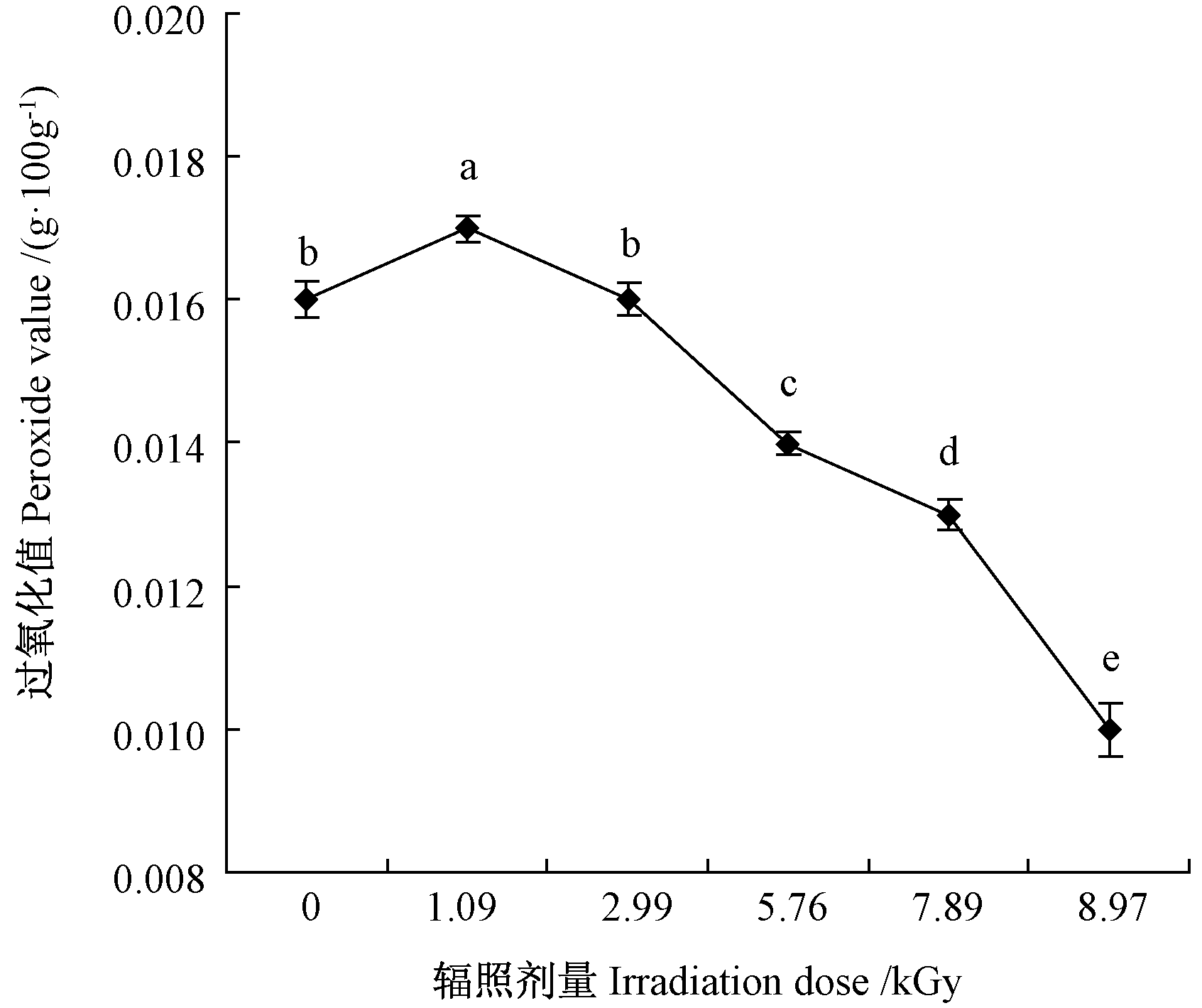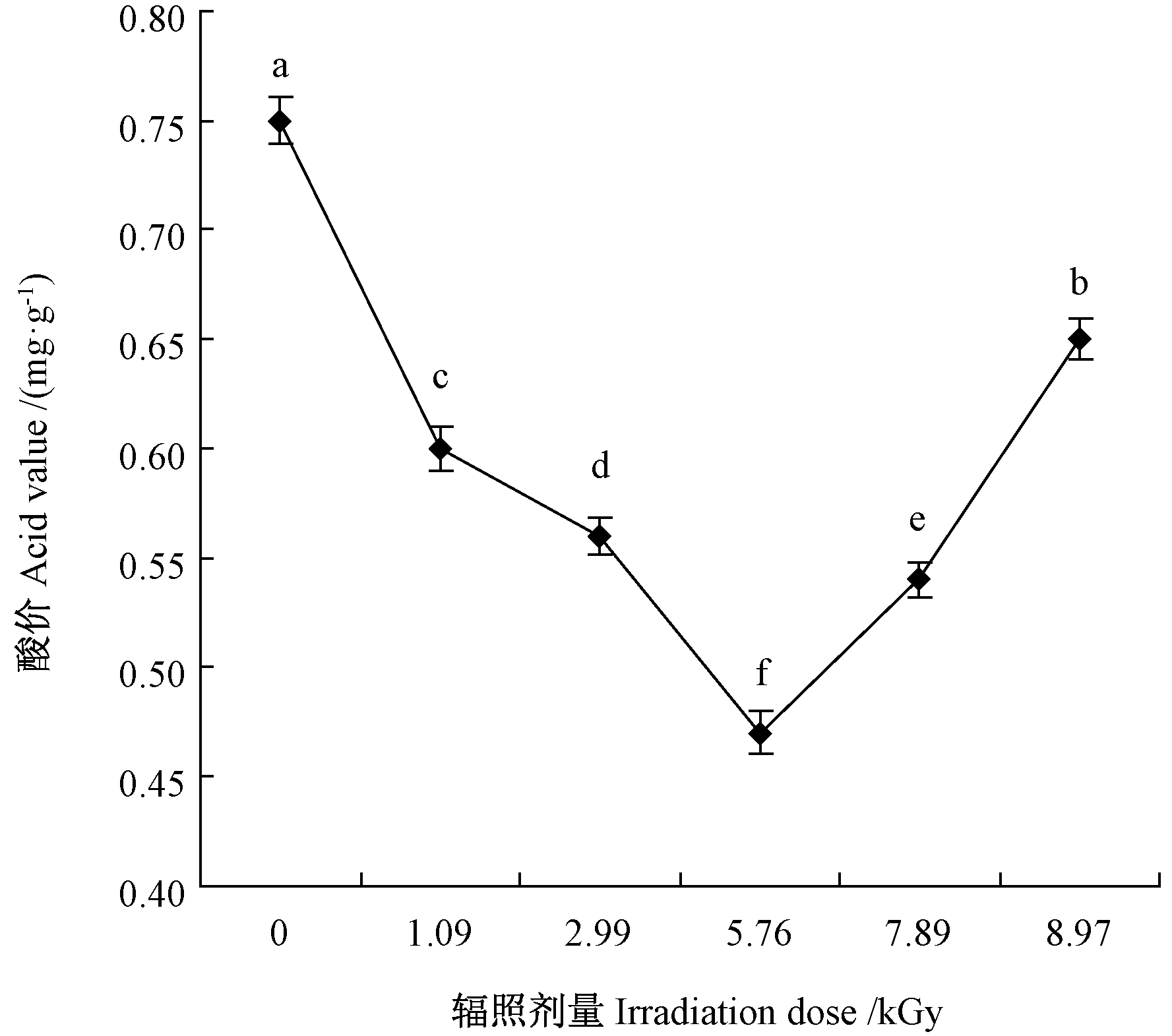 5.76 kGy劑量的電子束輻照對大豆蛋白含量、氨基酸含量及組成等營養成分影響不顯著, 含油率增加1.51%, 蛋白質的溶解度及尿素酶活性分別下降0.56%和5.67%, 酸價及過氧化值分別降低28.0%和12.5%, 該劑量輻照有利于保障大豆品質、改善氧化狀況、抑制大豆抗營養子活性, 提高蛋白質消化吸收利用率等, 是大豆的電子束輻照儲藏適宜劑量。