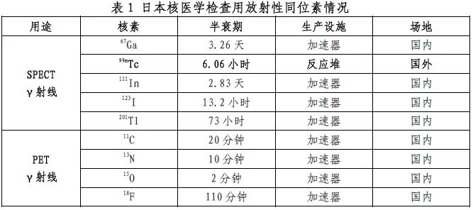 在日本使用Tc-99m進行骨顯像以明確癌癥位置的檢測數量約為100萬例/年,是Tc-99m僅次于歐美的第三大消費國。但是,日本目前其母體核素Mo-99全部依靠進口,由于海外生產用反應堆的老化和空運阻礙等會使供應變得不穩定,這從醫療經濟安全的角度來看是一個重大問題。表1是日本核醫學檢查用放射性同位素情況。